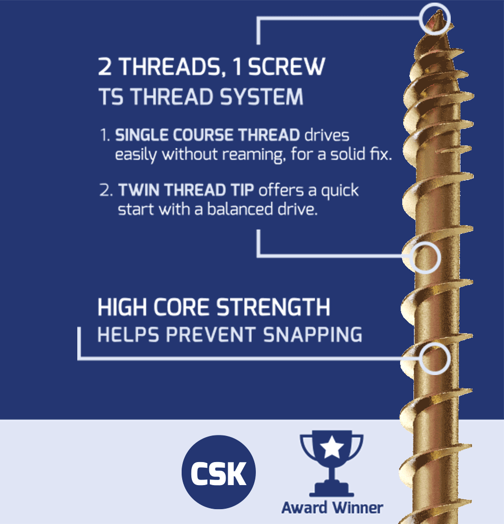 Whether it’s Hardwood, Softwood, Composite, MDF, Breezeblock, Stone or Metal, our performance driven range of screws has the solution to get the job done. Our multi-award winning screws work to outperform other brands, providing our users with genuine benefits through our patented Tri-Lock™ & TS Thread System.
