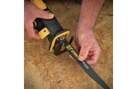 Reciprocating saws are handheld, portable saws with reciprocating blades that jut out from the saw's nose. The blades are interchangeable to allow them to cut many types of materials of different densities. They are designed for quick and efficient cutting rather than precision cutting. They are often used for demolition work to cut and rip out door frames, windows, joists, plasterboard, etc. With the right blade, reciprocating saws can cut through a wide variety of materials, including wood, metal, plastic, man-made boards and tree branches.